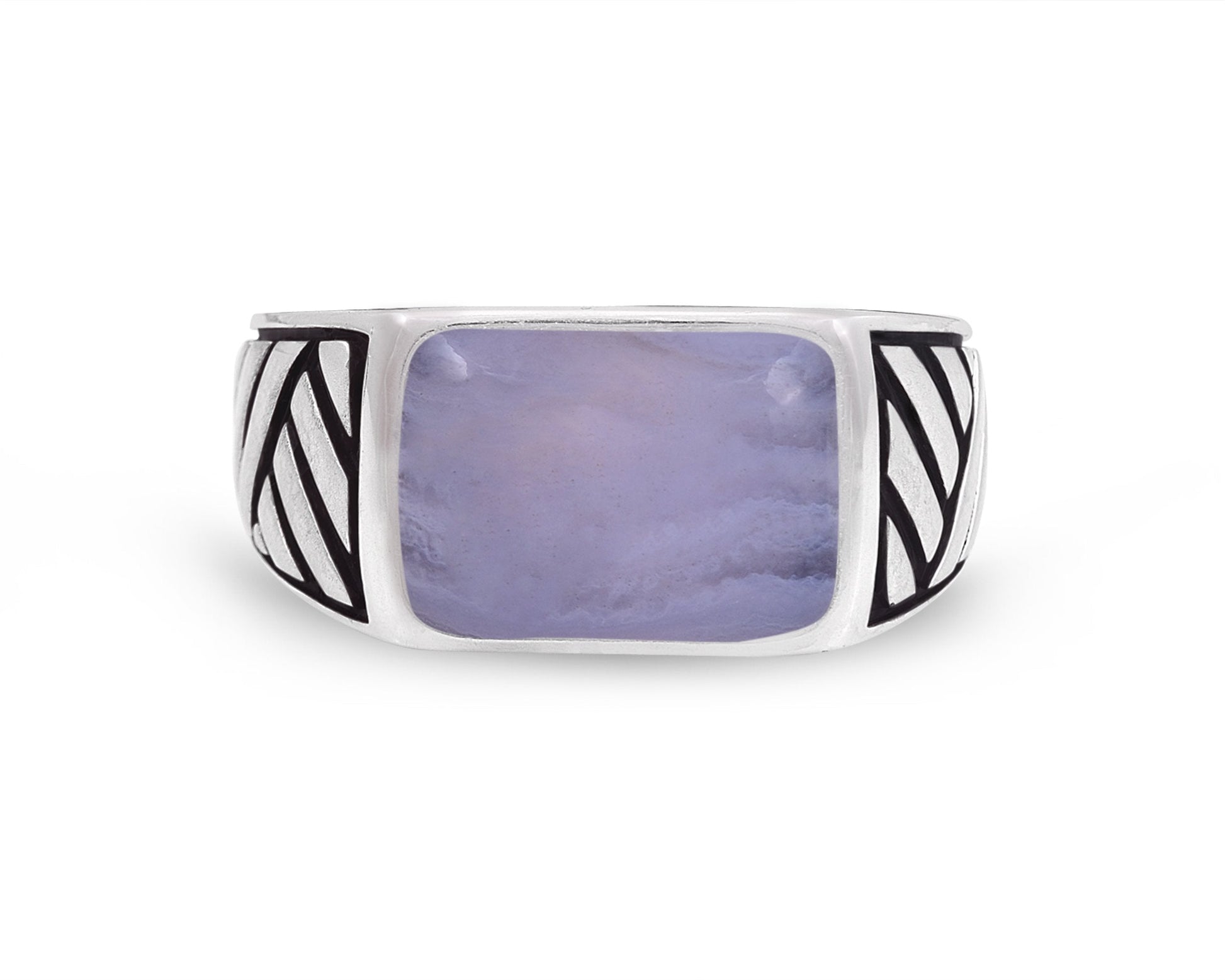 This Ring from the LMJ Origin Collection pays homage to Mother Earth's beauty and infuses light blue and white hues into a sleek, modern design. Crafted in 925 Sterling Silver, this edgy ring features a Blue Lace Agate stone with an Aztec-inspired precious metal texture on the ring shank in Black Rhodium.